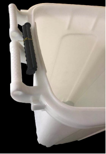 5、桶身把手采用两段式分体设计,把手上分布防滑颗粒,增强拉手的摩擦力和牢固度。桶身与把手连接纵向加强筋不少于8条,增强物理性。把手两侧配套垃圾袋挂钩配置,为环卫工人倾倒垃圾提供方便、清洁。