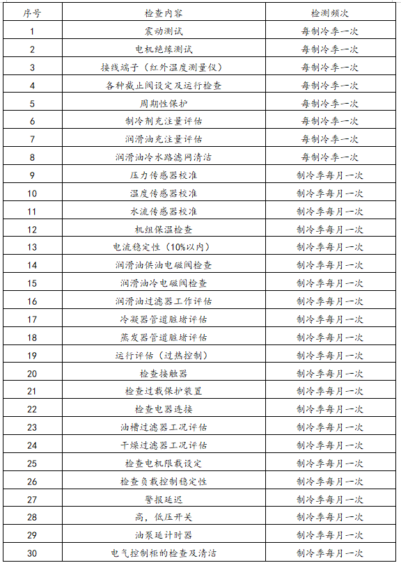 1.7机组和冷却塔一年一次清洗;皮带一年一换;对水泵一年不小于2次保养。