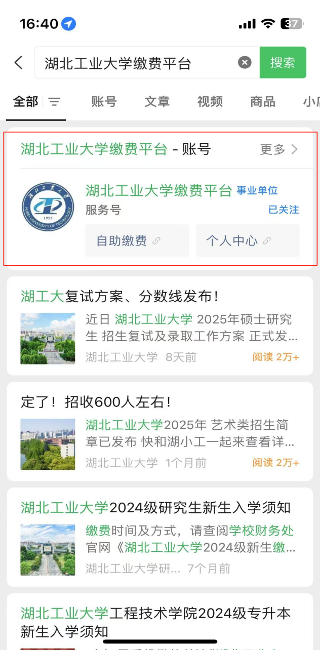 1. 移动支付操作流程缴费的用户需先微信搜索关注“湖北工业大学缴费平台”(服务号)