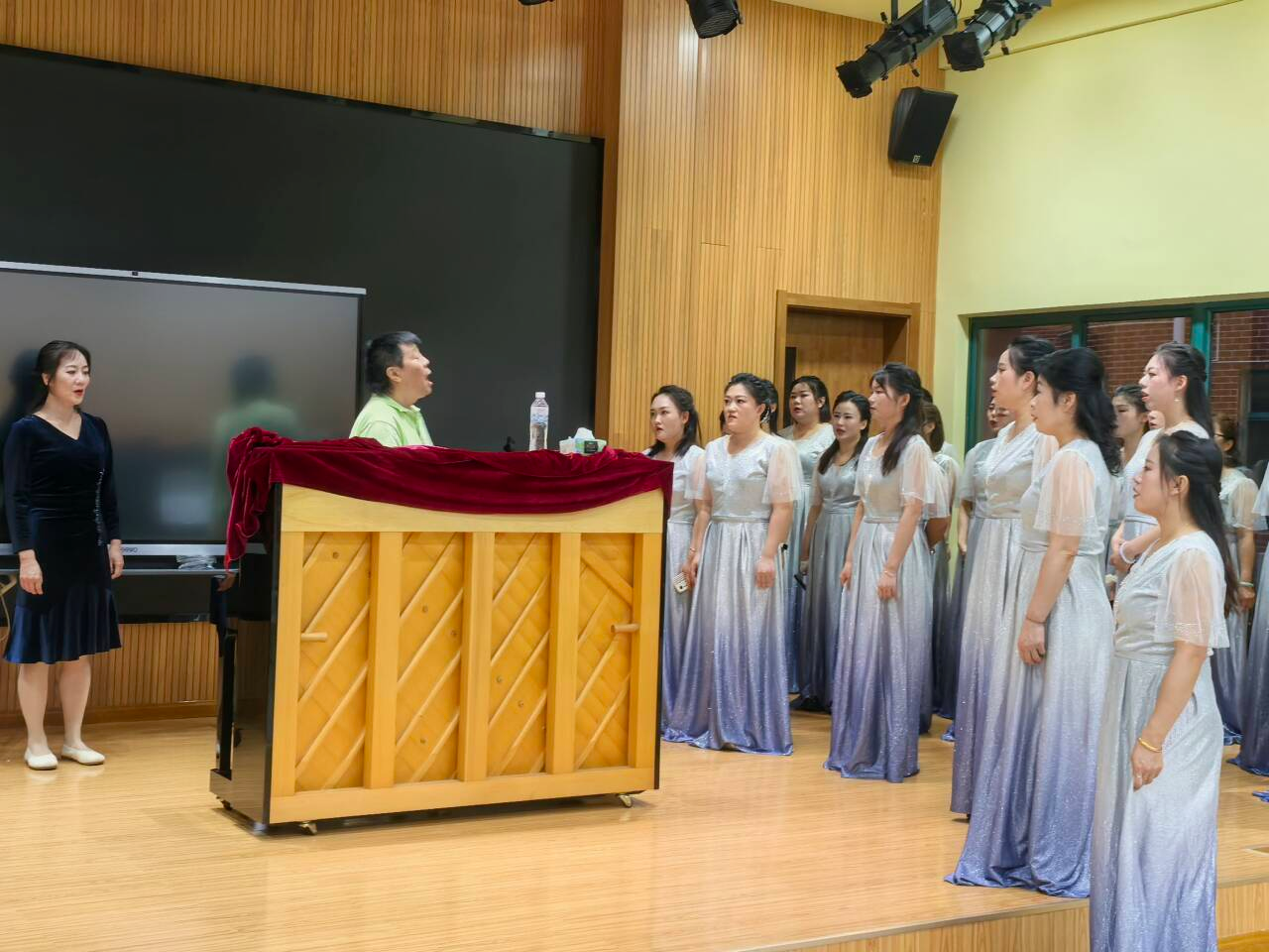 演唱现场,大家着装整齐,精神焕发,随着指挥的节奏,大家以饱满的热情和嘹亮的歌声投入到演唱中,歌声传递着对教育事业的无限忠诚与对美好生活的深切热爱。和谐统一的音色与深情并茂的演绎,深深打动了在场的每一个人。