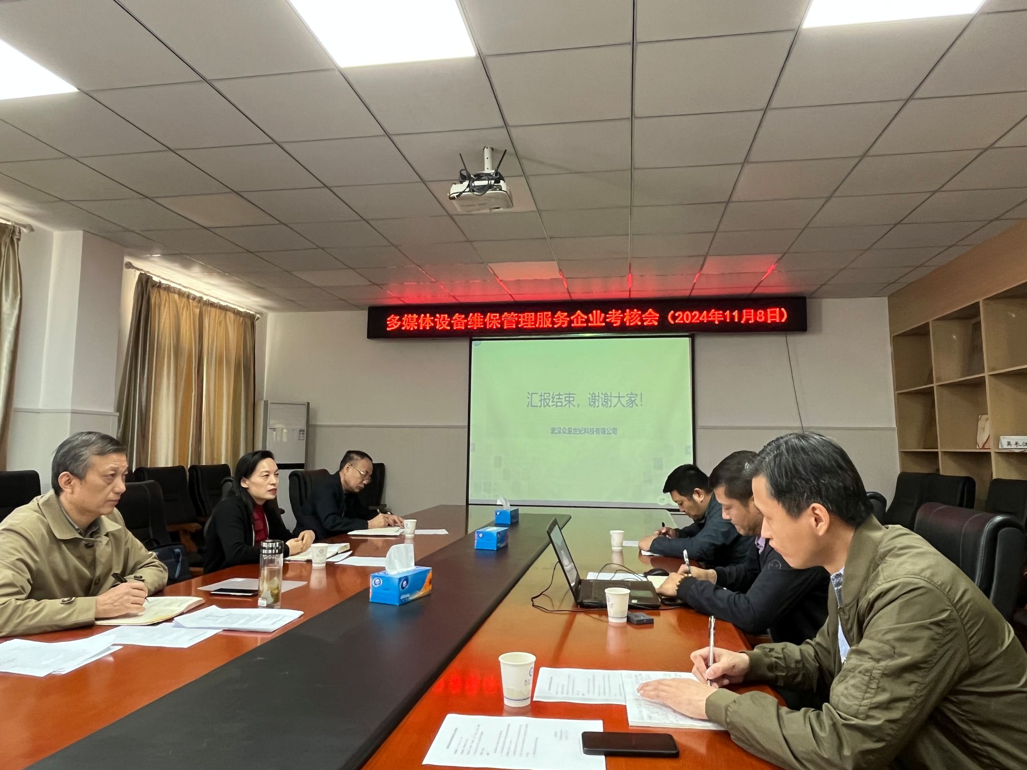 随后,服务企业驻校负责人陶勇作2023年-2024年度多媒体维保工作汇报。汇报结束后,与会人员对武汉众盈世纪科技有限公司多媒体维保服务进行考核评分,参会人员对维保公司后期工作提出具体意见和建议。