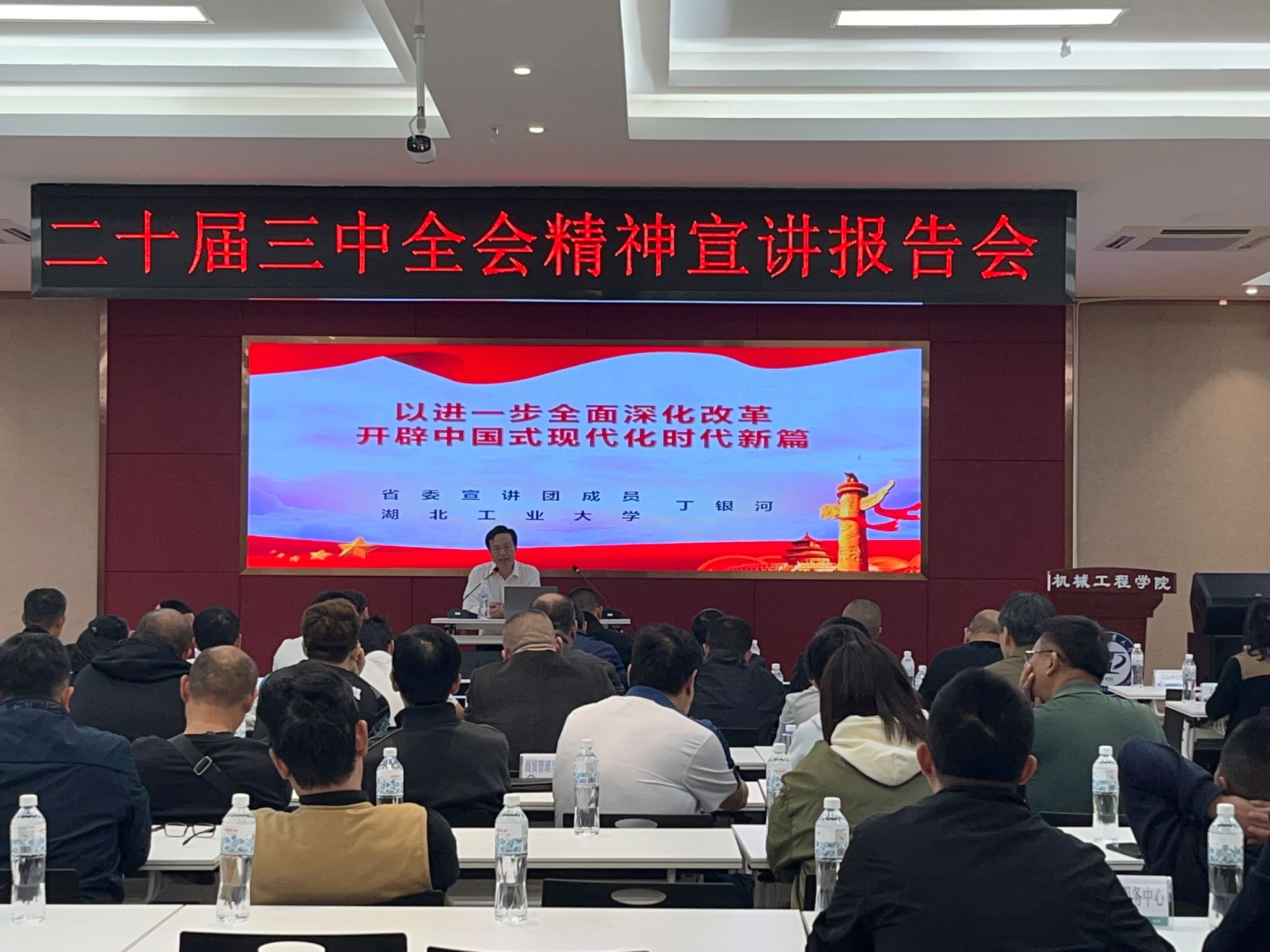 11月11日下午,省委宣讲团成员、学校马克思主义学院院长丁银河教授应邀为后勤管理处全体干部职工宣讲党的二十届三中全会精神。后勤党总支书记韦光辉主持报告会。