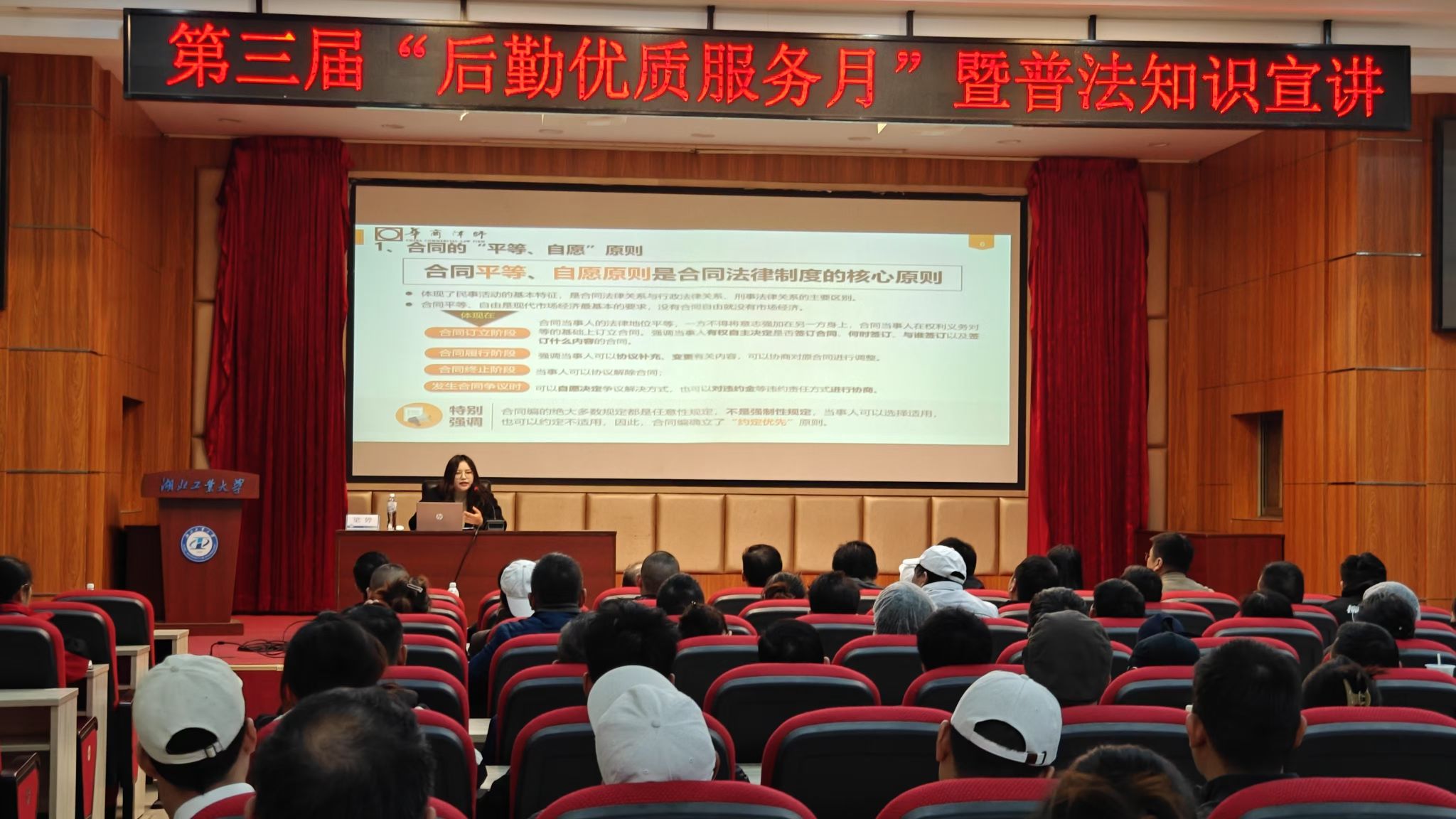 11月26日下午,第三届“优质服务月”之普法知识宣讲会在博学堂报告厅举行,本次宣讲由广东华商(武汉)律师事务所专职律师梁婷主讲,后勤管理处相关中心职工、各在校后勤服务企业管理人员及工作人员、学校各商业门面及食堂档口负责人及工作人员200余人参加了培训,会议特邀洪山区司法局、狮子山司法所、南湖派出所,及学校法制办、保卫处相关负责人参加,会议由后勤党总支书记韦光辉主持。