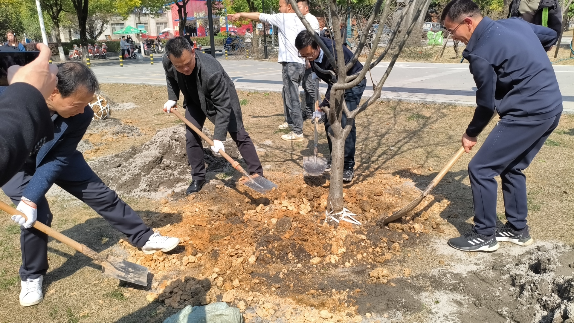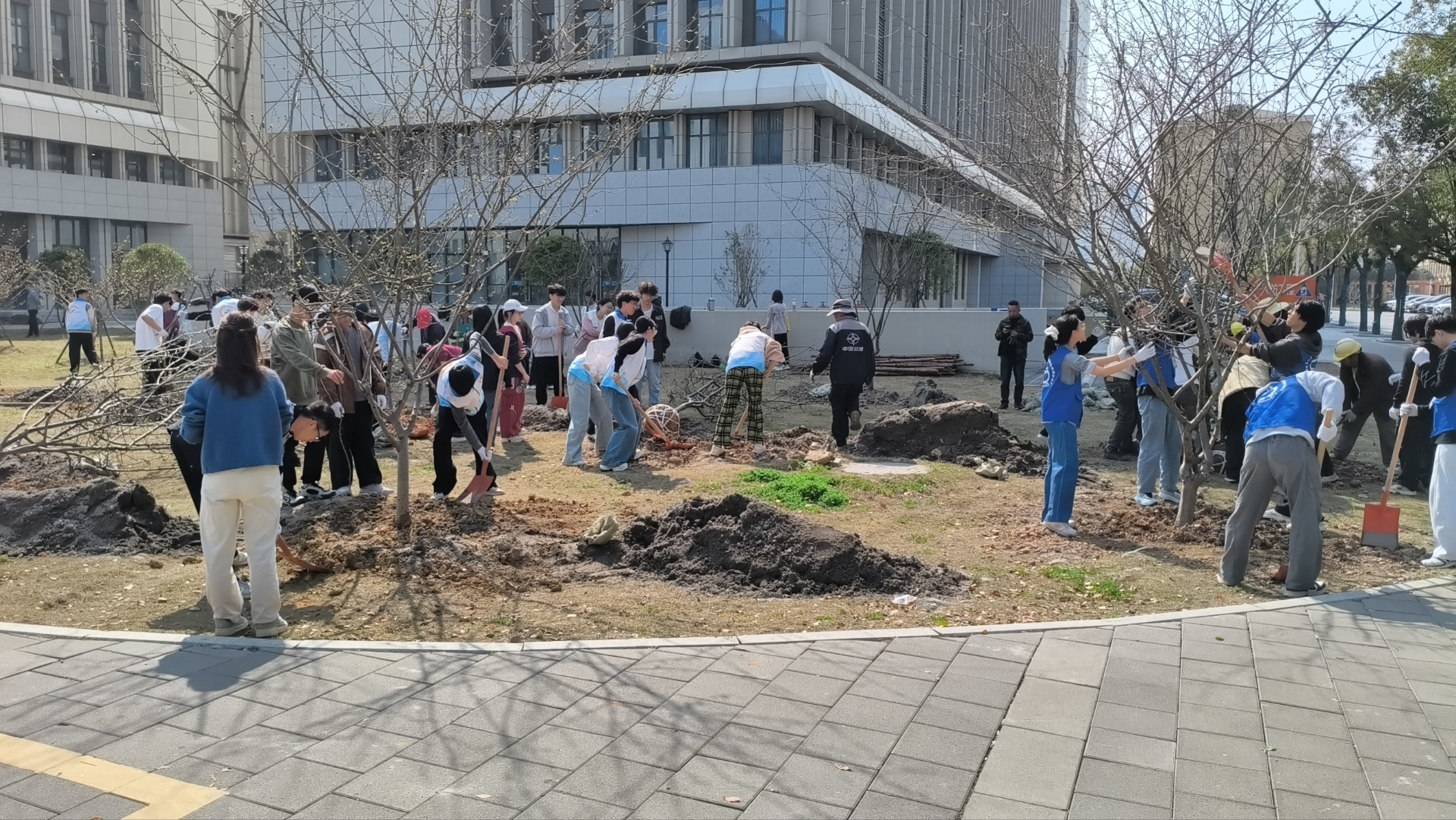 在技术人员的指导下,60余名师生迅速投入到热火朝天的植树劳动中。大家分工协作,配合默契:有的挥锹铲土,有的扶苗填坑,有的提桶浇水,每一个环节都一丝不苟,经过两个多小时的劳作,大家共同种下了象征共建与希望的海棠树,56株垂丝海棠在双创楼东侧绿地昂然挺立,为初春的校园增添了勃勃生机。
